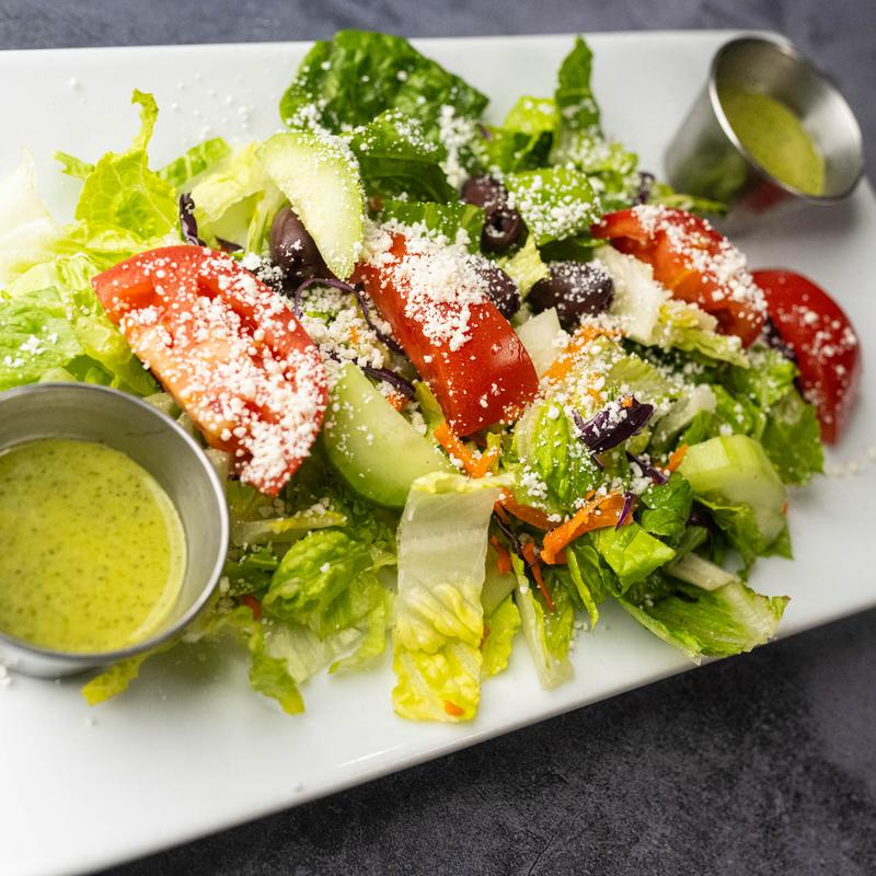 Chopped lettuce, tomatoes, olives, cucumber, mint and feta cheese topped with pita chips.